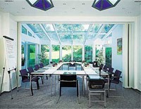 Der 60 qm große Seminarraum mit Wintergarten vermittelt unseren Gästen das Gefühl, mitten im Grünen zu tagen. Für die Pause zwischendurch hat man direkten Zugang zu Terrasse und Park. Außer diesem und dem Pavillon stehen Ihnen noch 2 Gruppenräume mit je ca. 25 qm zur Verfügung.